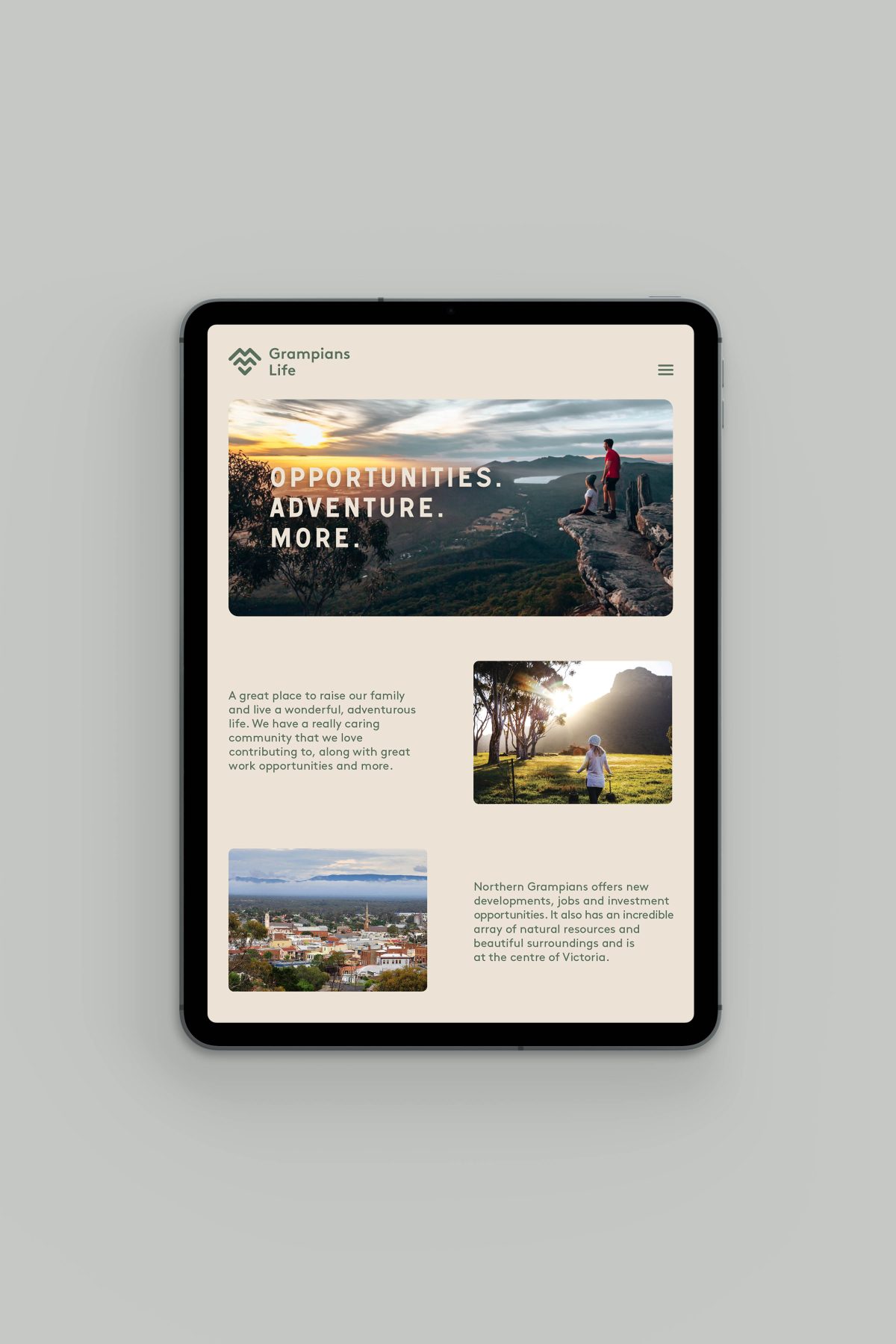 A series of workshops with Council and community were undertaken to create the values and brand proposition. The result was ‘Grampians Life’, a brand to position the Northern Grampians as a great place to raise a family and live a wonderful, adventurous life. It is a caring community that love to contribute, along with great work opportunities and more.